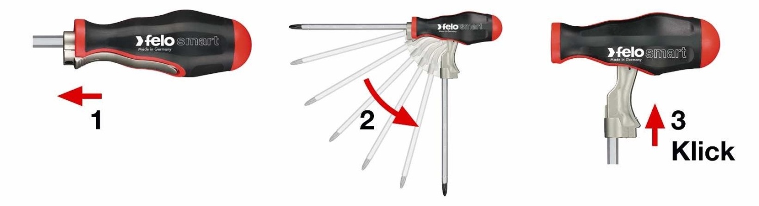 Patentirana trokomponentna ručka sa fleksibilnim plastičnim ćelijama smanjuje stres i umor, dok pruža maksimalan prenos obrtnog momenta. Poboljšani okretnog mehanizam omogućava jednostavno pretvaranje ručke u odvijač u obliku slova T, pružajući dodatnu silu pri radu. Svi bitovi imaju veličinu sedišta 1/4”, što ih čini pogodnim za korišćenje i sa električnim alatima.