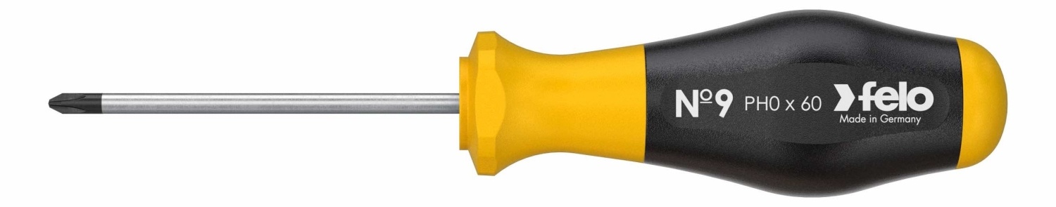 Felo profesionalni šrafciger No. 9 PH0 x 60 Phillips križna glava 900 022 10 sa dužinom oštrice od 60 mm. Ergonomija dvokomponentne ručke i materijal protiv klizanja (Soft Grip) pomažu da se obezbedi najveći prenos sile. štap je napravljen od hrom-vanadijum-molibden čelika visoke čvrstoće. Crni vrh šrafcigera (Black-Tip) obezbeđuje precizno uklapanje u pričvršćivač.