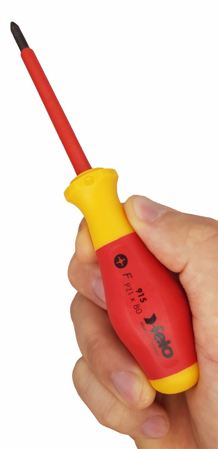 Električno siguran šrafciger Felo Ergonic serije No. 9 VDE 91510290 Pozidriv PZ1 x 80, dužina osovine od 80 mm, ukupna dužina alata je 170 mm. Dizajniran za rad pod naponom do 1000V.