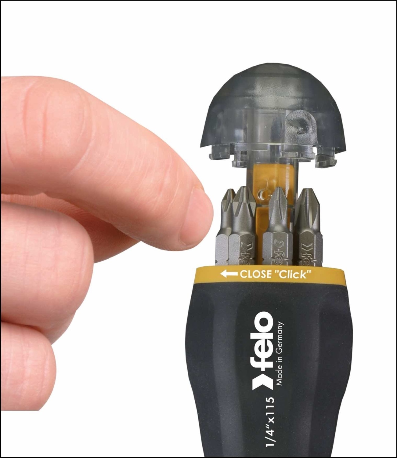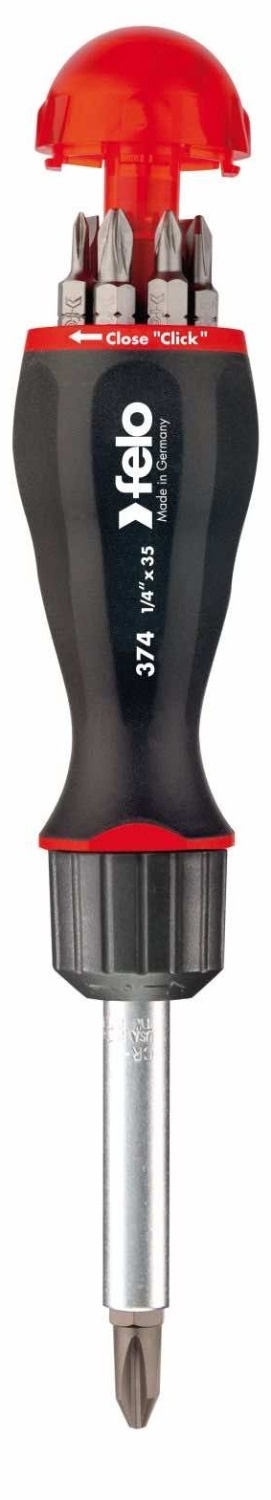 Reverzibilni držač bitova sa magnetom može da zameni ceo set šrafcigera. Sa čegrtaljkom tipa čegrtaljke - rotacija levo i desno, fiksna pozicija. Ispod šestougla 1/4 C 6.3. Komplet držača uključuje 8 bitova k 25 mm. Ergonomska drška od meke sintetičke smole sa odlaganjem bitova. Dužina sa produžetkom - 185 mm. Produžni kabl za ručnu i maŠinsku upotrebu.