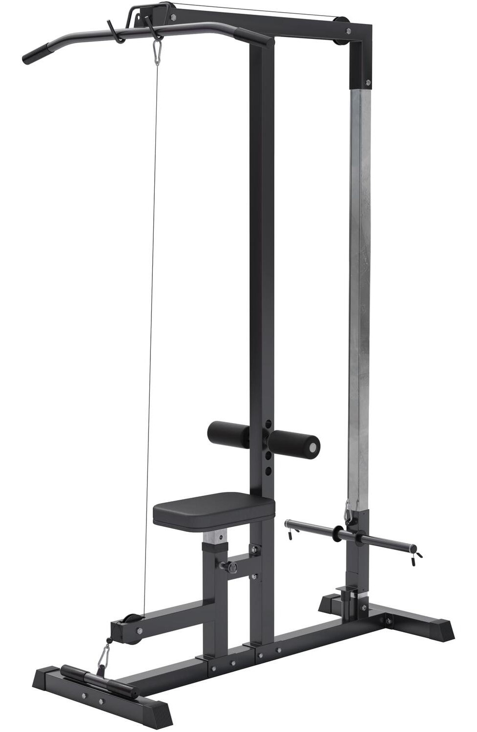 Mašina omogućava izvođenje širokog spektra vežbi uz pomoć dve šipke za povlačenje i dodatnih nastavaka za specifične mišićne grupe. Tapacirano sedište i podesivi držači za noge omogućavaju udobnost i sigurnost tokom vežbanja.