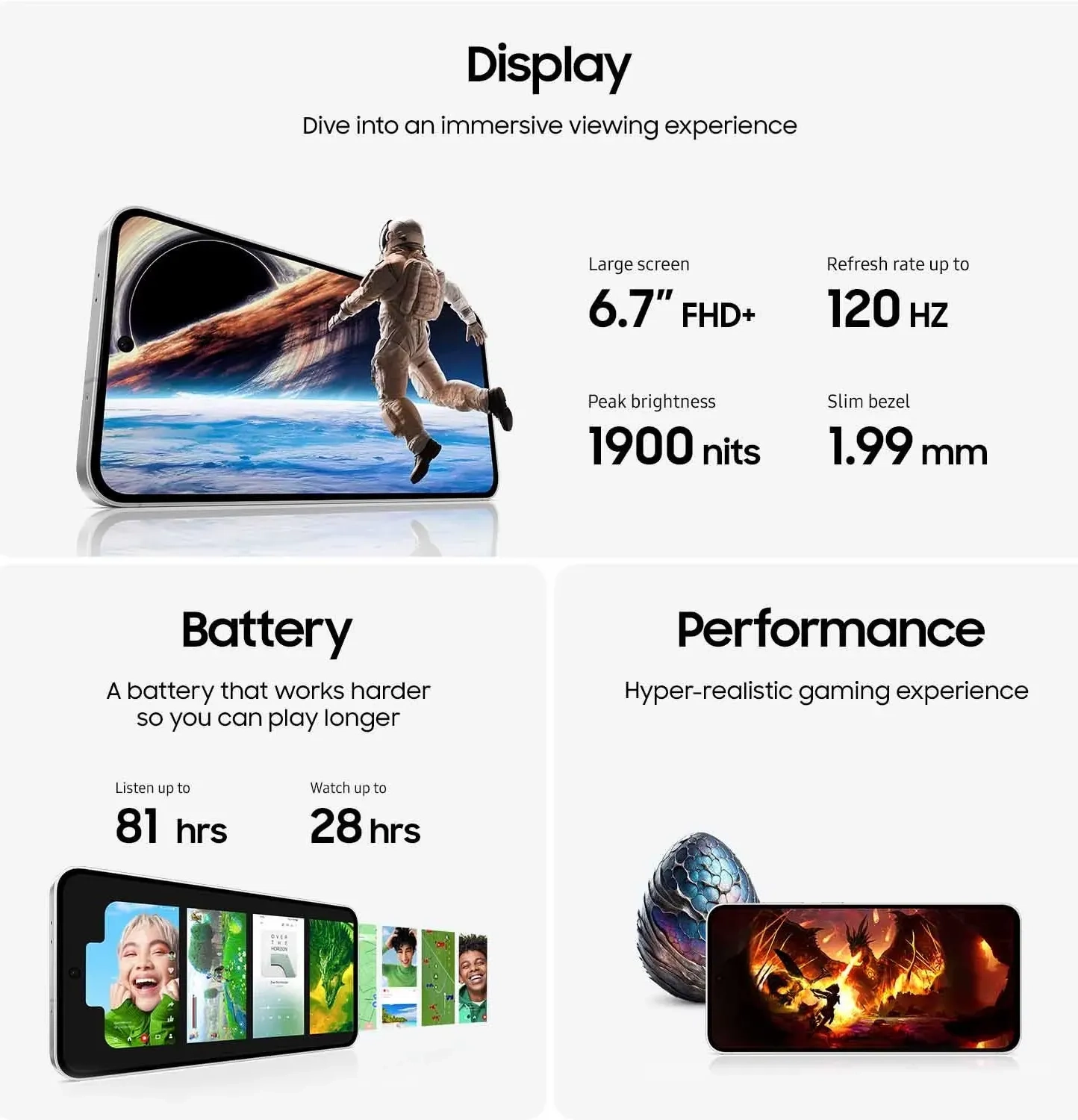 Displej: Galaxy S24 FE ima maksimalno osvetljenje od 1900 nita. Ekran je adaptivan, automatski prilagođavajući nivo svetlosti u zavisnosti od okruženja. U područjima sa osvetljenjem od 5000 lux ili više, aktiviraće se režim visoke svetlosti i Vision Booster.