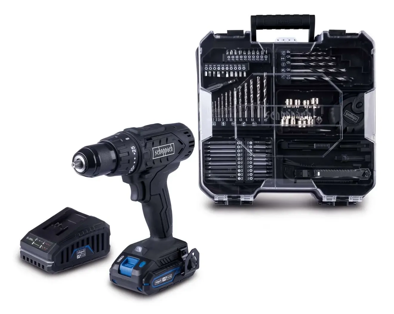 Uključuje bateriju od 20 V / 2,0 Ah, punjač od 2,4 A i set dodataka od 74 komada: 1x skalpel, 1x stolarska olovka, 1x mjerna traka , 8x nasadnih ključeva 1/4”, 5x burgija za drvo, 14x burgija za metal, 10x bitova 50 mm, 10x bitova 75 mm, 20x bitova 25 mm, 1x držač bitova 1/4”