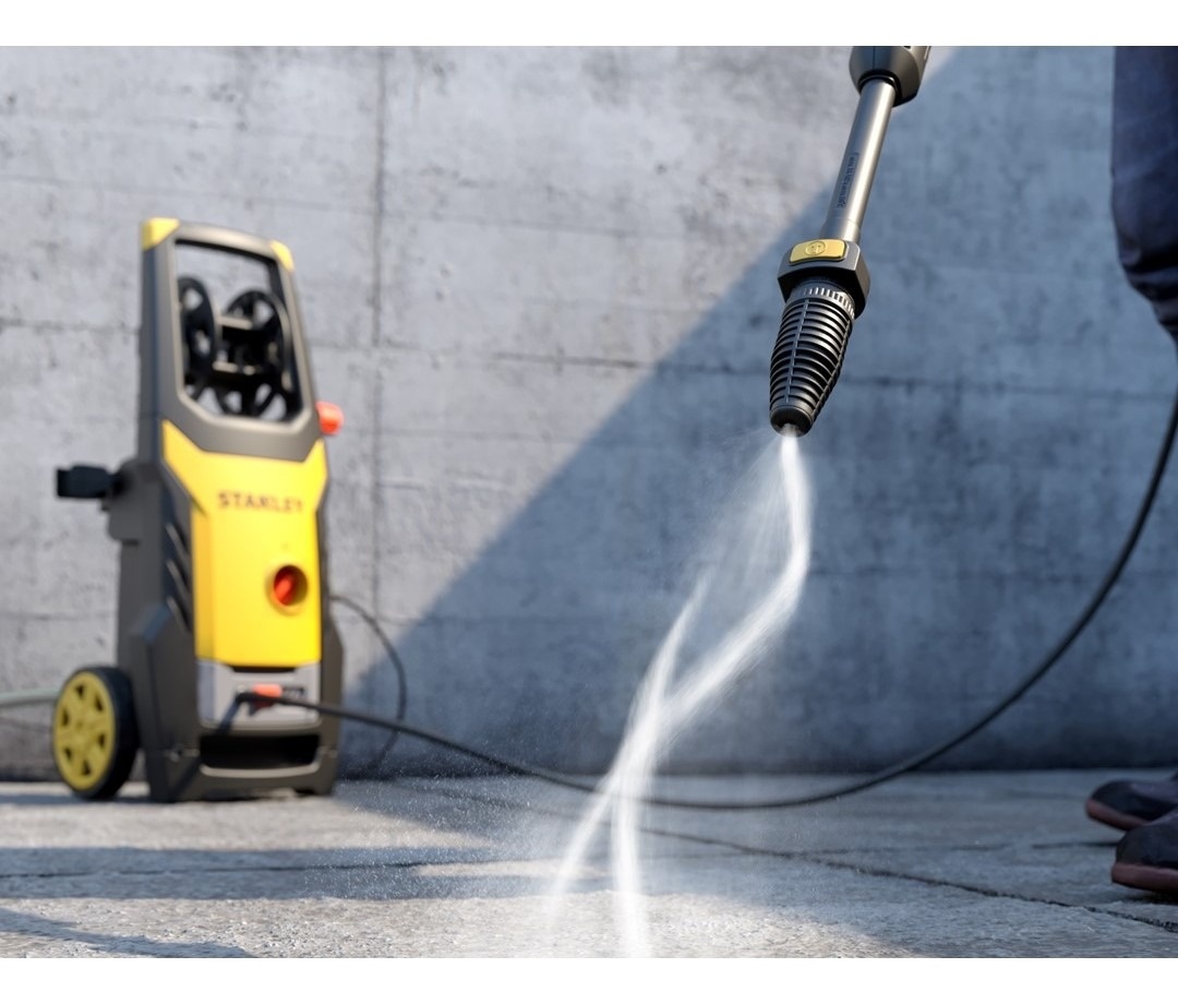 STANLEY električni perač pod pritiskom od 1600W uključuje okidač pištolja, produžnu cev, rotacionu i podesivu mlaznicu, crevo i komplet za bocu sa pjenom.